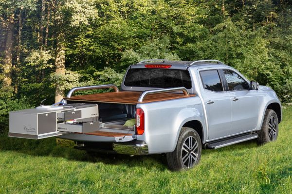 A VanEssa mobilcamping cég alapvetően egyterűek és kisteherautók belsejébe szánja praktikus tárolóját, hiszen afölött még ágyat is el lehet helyezni. Utóbbira nincs lehetőség a plató miatt, így tíkfából készült borítást készítettek a konyha fölé; aki nagyon akar, tetősátrat is elhelyezhet efölött. A modul tömege 250 kg, hidraulikahenger tolja ki a konyhát használathoz, a rakfelület másik oldalát kihúzható fiók foglalja el.