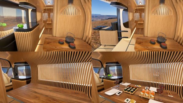 A digitális nomádok mellett azoknak is ideális lehet az Alpine hifigyártó által készített Cross Cabin lakóautó, akik nem helyhez kötött irodában akarnak dolgozni. A Ford Transit alapján megvalósított tanulmány belsejében a japán minimalizmust követték; a faburkolat rejti a különféle tárolóhelyeket, a világítást. A beltér középpontjában a forgatható asztal van, amit irodai munkára (a lap felhajtásával bukkan elő a 32 colos képátlójú monitor, amit az ügyfél laptopjának kiterjesztéseként lehet használni), étkezéshez és konferenciaasztalként is lehet használni. Az Alpine nagy teljesítményű, több készüléket kezelni képes wifi-routere gondoskodik a fedélzeten használt kütyükről.