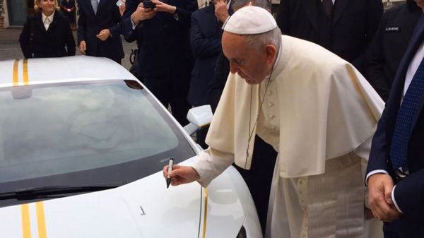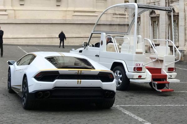 A Lamborghini autógyár ünnepélyes keretek között adta át Ferenc pápának az Ad Personam nevű műhely által módosított, hátsókerékhajtású Huracán sportkocsit. A karosszéria alapszíne Bianco Monocerus nevű fehér árnyalat, a csíkokat a Giallo Tiberino nevű sárgával készítették – ezek a vatikáni lobogó színei.