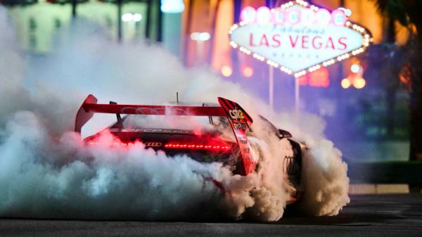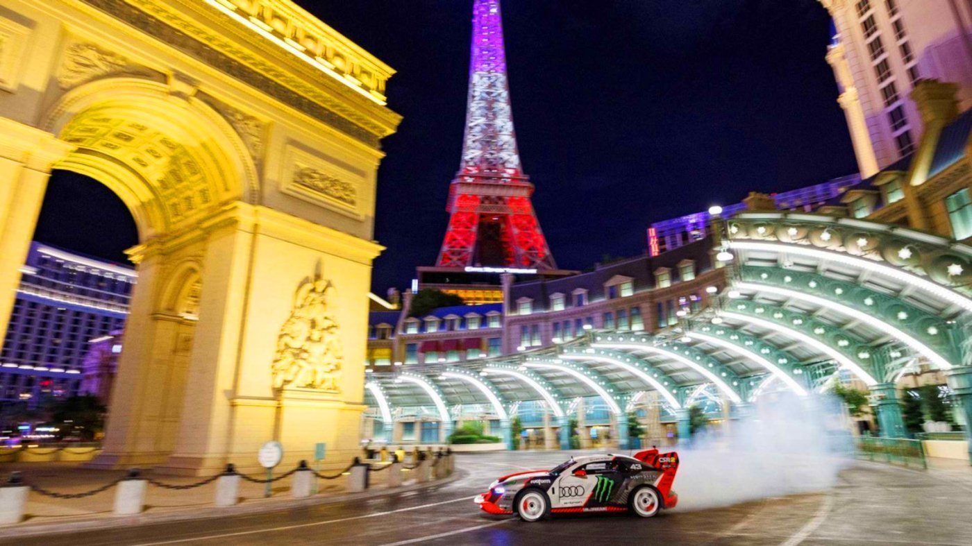 Nem állta meg az Audi, hogy a Ken Block számára készített villanymotoros S1 Hoonitron kaszkadőrautóval készített első látványos videóban, az Electrikhana nevű alkotásban azért az aktuális versenyautók is tiszteletüket tegyék, persze a főszerep inkább Las Vegasé, ahol nem csak a főutcán, de bizony az egyik kaszinó épületében is látványosan autózik Ken Block.