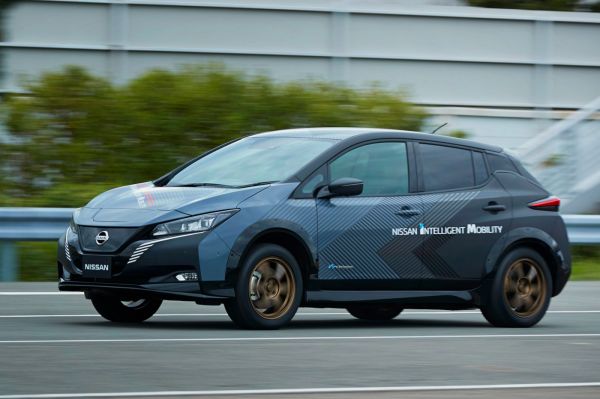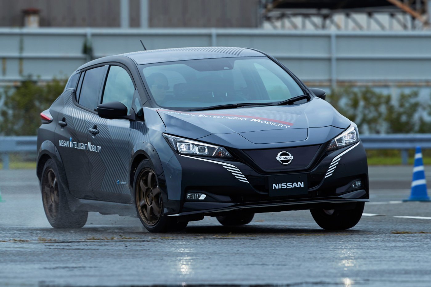 Amíg a Nissan Ariya tanulmány hajtását nem részletezik, a „hamarosan érkező” villanyautó tudásáról majdnem mindent elárul az itt látható Nissan Leaf kísérleti autó. A lényeg a két motoros hajtás, ami 309 lóerős rendszerteljesítmény és 680 Nm-es rendszernyomatékot biztosít, és a motoros szabályozásával csökkentik például a karosszéria előrebillenését energia-visszatermeléskor – a fotó tanúsága szerint gyorsításkor erősen ágaskodik a karosszéria.