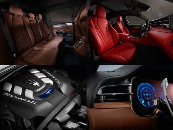 A műszerfalon a képernyők uralkodnak, a középkonzolon van a klasszikus központi érintőképernyő (12,3 col képátló) és egy alsó érintőképernyő (8,8 col képátló), amivel a fizikai kapcsolókat váltják ki. Van még két másik kijelző, az ma már alap, hogy a volán mögött monitor tájékoztat, de az új elem, hogy a műszerfal közepén elhelyezett óra is vetített számlapot kap. Új multimédia rendszert használ a Grecale, opciósan elérhető a 21 hangszórós, 3D-hangzást biztosító Sonus faber hifi. A választható extrákkal inkább csak egyedibbé lehet tenni a kialakítást, a kárpit színét, anyagát és a műszerfal díszbetétjét tekintve, amúgy három egyéniséget kínálnak, ami rögtön a motorválasztást is jelenti.