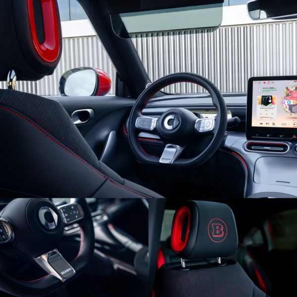 A Brabus tervezői kívül-belül sportosabbá tették a Smart#1 megjelenését, de igazából csak a piros díszek miatt tűnik fel, hogy a modellsorozat csúcsmodelljével van dolgunk, igaz, a 19 colos felnik is látványosak. Az utastérben az Alcantarával bevont kormánykerék, a hasított műbőr-kárpit jelenti a változást, a díszvarrást piros cérnával készítik, pirosak az övek is. A fémpedálok mellett az átlátszó műanyag napellenzők különböztetik meg a hétköznapi társaitól a Smart#1 Brabus-t.
