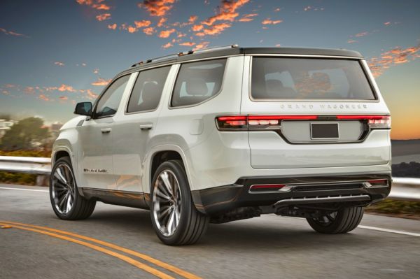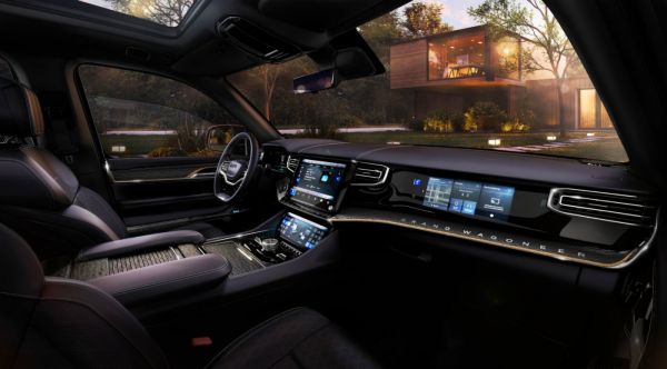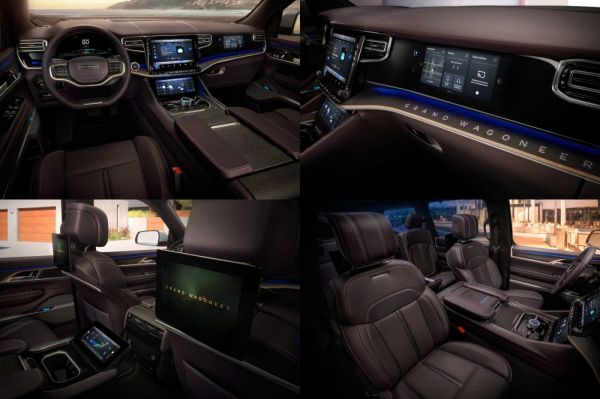 Ezúttal nincs famintás fólia a karosszéria külsején, cserébe van megvilágított hűtőrács, és – mintha számítanak valamit az öt méternél hosszabb téglatestnél –, fekete tetővel karcsúsítják a vonalvezetést. A kerékjáratokba 24 colos felnik kerülnek, amelyeknél 3D-nyomtatással készített díszeket is elhelyeznek. Első prémium szabadidő-autóként a Grand Wagoneer kap kijelzőt az utas elé, persze egyébként se spórolnak a monitorokkal: a kormány mögé egy 12,3 colos kerül, a központi kijelző 12,1 colos, alatta van egy 10,25 colos a klímavezérléshez, az utas elé egy másik 10,25 colos kijelző kerül. A második sorban az üléstámlákon van egy-egy 10,1 colos monitor, középen egy 10,1 colos harmadik kijelző segít a klíma vezérlésében.