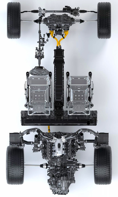 Talán azért kellett megnövelni a karosszéria méreteit, mert olyan sok technikát zsúfoltak bele. Van orr- és középmotor is, elöl 2 villany-, hátul egy V6-os benzines biturbó és egy villanymotor található, utóbbiaknál még egy 9 fokozatú dupla kuplungos váltót is használnak. A hátsó elektromotor dolga hajtáson és energia-visszatermelésen kívül az egyébként is finom váltások kisimítása. Elöl egy-egy villanymotor hajt egy-egy kereket, kanyarban szükség szerint azonnal be tudnak kapcsolódni a hajtásba.
