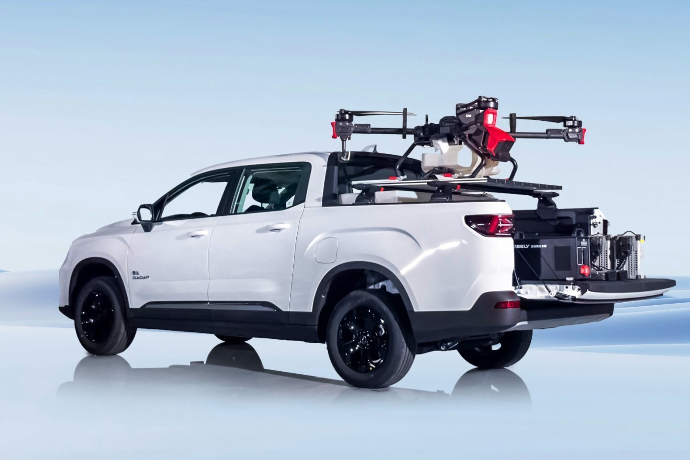 A legnagyobb újdonság azonban a mezőgazdasági drón, amelynek szállítására-landolására egy masszív alumínium fedélzetet szerelnek a plató fölé, a raktérben kapnak helyet a kemikáliák szállítására szolgáló tartályok, a drón töltését a megfelelő adapterrel a töltő-csatlakozón keresztül lehet végezni. A Radar RD6-os alkalmazásán keresztül lehet vezérelni a mezőgazdasági drónt. A Geely által készített drón egyébként feláras, alapesetben csak a landolóplatformot adják, így akinek már van mezőgazdasági drónja, annak nem kell egy újabbra beruháznia. A 2 hajtómotoros összkerékhajtás rendszerteljesítménye 272 LE, nyomatéka 384 Nm, a 63 kWh kapacitású lítium-vas-foszfát akkumulátor a kínai szabvány szerint 410 km-es hatótávolságot biztosít. A fedélzeti töltő 7 kW-os, 120 kW teljesítményű villámtöltés fogadására alkalmas az akkumulátor.
