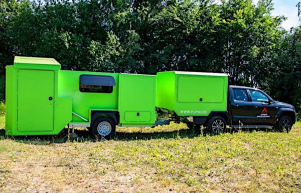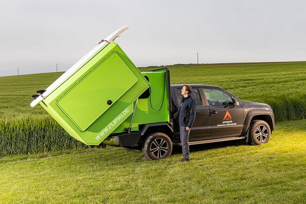 A terepjáró járműveknél gondot tud okozni a magasan lévő lakótér megközelítése, erre jelenthet megoldást a német Flip90 cég ötlete, amelynél a külső héj gombnyomásra hátrafelé lefordul, padlószinten lévő résszel egészítve ki a lakókocsi vagy épp a pickup hátuljára szerelt lakódoboz életterét. Egy normál (nem emelt futómű) pickup magassága 2,28 méter alatt marad, így szükség esetén konténerben is szállítható a jármű.