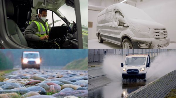 A sorozatgyártás megindulása előtti végső tesztelési fázisnál tart a Ford E-Transit fejlesztése, ennek során 12 hét alatt 10 évnyi terhelést kap az autó. Észak-Amerikában télen tesztelik az autókat közúton, a kölni fejlesztőközpontban lévő kamrában extrém hideg és extrém meleg hőmérsékleten vizsgálják a tudását, a belgiumi Lommelben lévő tesztpályán pedig a mesterséges kátyúkkal tűzdelt útvonalon köröznek az E-Transittal.