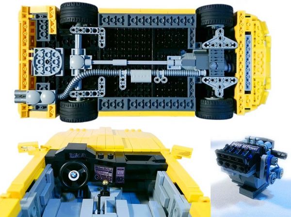 A körülményekhez képest sikerült egész jól megőrizni a részleteket és az arányokat, annak ismeretében különösen jó a terv, hogy az ajtók, a motor- és a csomagtértető is nyitható. A négyhengeres motor kivehető, így külön is megcsodálható, itt és a műszerfalon vannak matricák, egyébként már létező kockákból épült a kisautó.