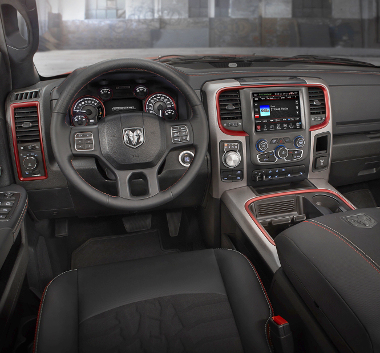 Az utastérben piros-fekete színek kontrasztja teszi sportossá a hangulatot, az ülések műbőr kárpitját az abroncs futófelületének mintájával díszítik még. A különféle helyeken elhelyezett emblémákon kívül nagy méretű, könnyen takarítható szőnyegeket kap még az utastér. A kardánalagúton elhelyezett tárolórekeszek (pohártartó, kütyüfiók) mélyebbek lettek, hogy terepjárás közben is biztosan tartsák a beléjük helyezett tárgyakat. Csak a Ram benzinmotorjait (3,6 literes V6-os vagy 5,7 literes V8-as) lehet kérni, a 3,0 literes V6-os turbódízel nem elérhető a Rebel felszereltséggel.
