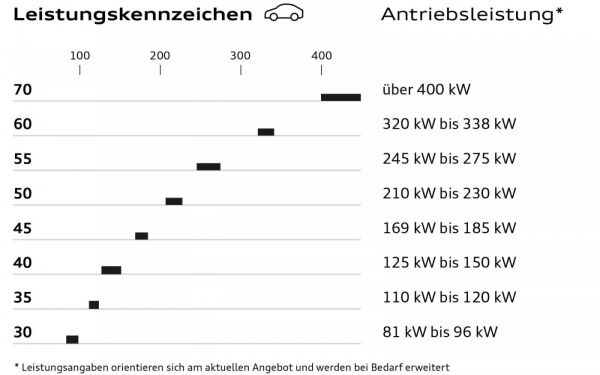 Huszonöt lesz a legkisebb kétjegyű szám, aztán ötösével következnek az ugrások, érdekes módon az ezt magyarázó ábráról lemaradt az alapszintet (110 lóerőig) és a 460-544 lóerő közötti tartományt jelző szám, úgy tűnik, az Audinál is zavart okoz az új névadási rendszer.