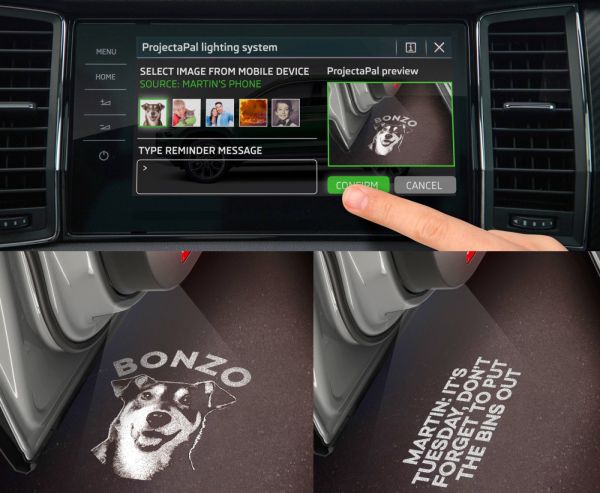 A Škoda viccnek szánja, de valóban hasznos lehet az az üdvözlőfény, amelyen keresztül üzenni lehet a sofőrnek, például hogy ne felejtse el sétálni vinni a kutyát, vagy hozzon a boltból két kg krumplit, vagy hogy kedd lévén vigye ki a kukát a ház elé.