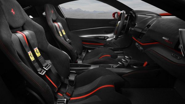 Amíg kívül egyértelműen az aerodinamika határozza meg a Ferrari 488 Pista megjelenését (meg a megfelelő helyen kontrasztos színű fényezés), az utastérben mindent a tömegcsökkentésnek rendeltek alá, tehát hiányoznak az extrafelszerelések vagy épp a hangszigetelés. Utóbbi mellett a karbon fokozott használatának köszönhető az 1280 kg-os száraz tömeg.