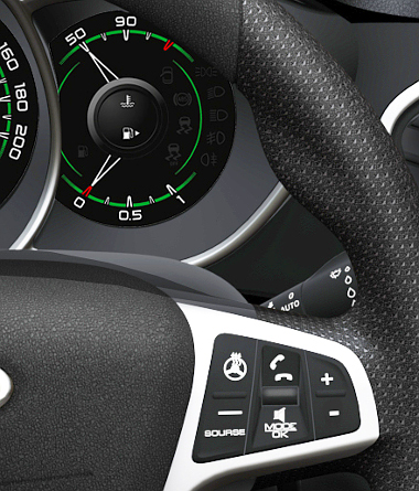 Modern formát mutat a számítógépes ábrázolás, a vezetőt analóg műszerek informálják, és igen, a hűtővíz-hőmérséklet is leolvasható. Igazi orosz autóról lévén szó kemény telekre is felkészítik a kocsit, a küllőn lévő kapcsoló szerint lesz majd kormányfűtés, a középkonzolon pedig látunk egy kapcsolót, ami talán extra motorfűtést (emelt alapjárat?) jelent. Az előválasztókar-mögötti két vakkapcsoló minden bizonnyal az ülésfűtésnek van fenntartva.