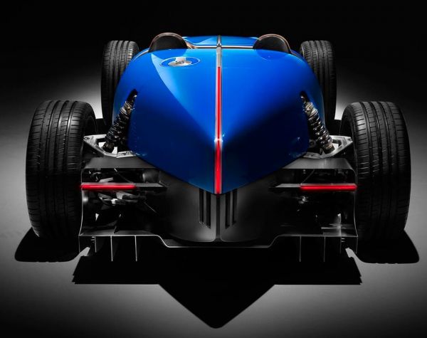 Természetesen Bugatti-kék színére fényezték a karosszériát, amelyen a krómmal keretezett hűtőrács és a bőrrel-alumíniummal borított utastér a leginkább retrós elem. A műszerfal egyébként a két ülés közötti konzolon elhelyezett három órát jelent, vegyesen analóg-digitális technikával. Az Uedelhoven Studio nem árulta el, milyen hajtás került a Bugatti Type 35 D orrába, ránézésére a modern kori 1500 lóerős 8,0 literes négy turbós W16-osnak nincs ott helye, de a kis méretek és a vélhetően alacsony saját tömeg miatt szerényebb erőforrással is nagy tempóra képes a retró-roadster.
