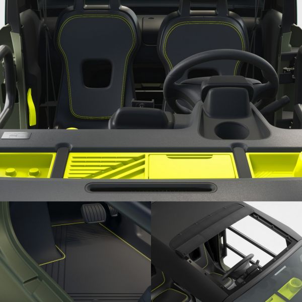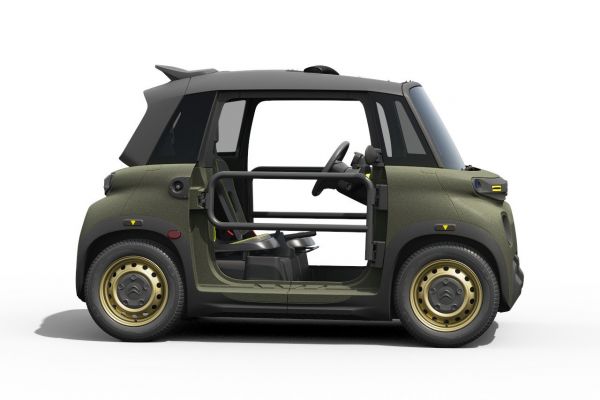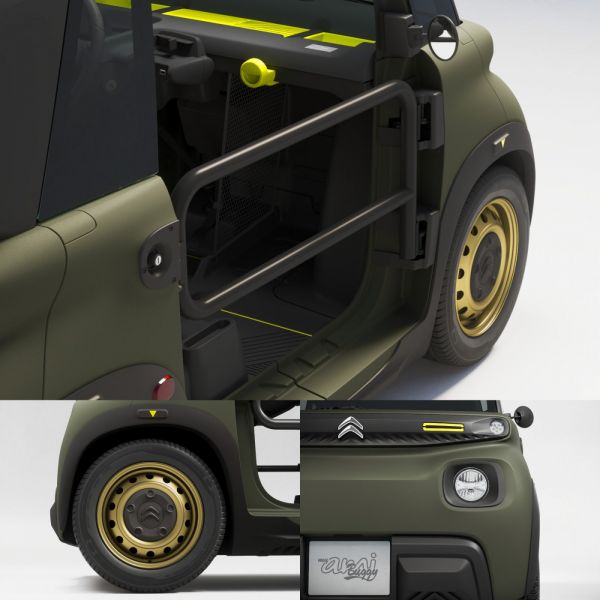 A karosszériát feldobó élénksárga dekorelemek vidámságot csempésznek a My Ami Buggy sziluettjébe. Elöl két neonsárga matrica teszi izgalmasabbá a jármű orr-részét. A kerékjárati ívekre ragasztott nyilak is ugyanilyen színűek. A repülés világából ismerős, különböző funkciókat jelző műszaki elemek itt kizárólag dekoratív célt szolgálnak. A még stílusosabb megjelenés érdekében a My Ami Buggy fekete felniközéppel ellátott, 14’’ aranyszínű perforált keréktárcsákkal büszkélkedik. A kerekek közepén a Citroën márkaembléma látható. A kontrasztos keréktárcsa tökéletesen passzol a khaki zöld karosszériához. Az első rendszámtábla személyre szabható, az ügyfél bármilyen üzenetet írhat rá, és ezáltal még inkább a magáénak érezheti a járművet. Az autó védelméről a khaki zöld karosszériával megegyező színű Ami védőponyva gondoskodik.