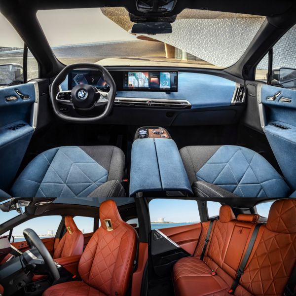 A BMW állítása szerint az iX első autójuk, amelyet belülről kifelé terveztek, azaz először is elkészítették az otthonos belső teret, majd mindezt egy szabadidő-autó karosszériával vették körbe. Az elektromos hajtásból adódóan könnyű dolga volt a tervezőknek, a padló alá helyezett akkumulátor miatt nagy és sík az utastér padlója, nincs kardánalagút. A két első ülés közötti konzolt úgy alakították ki, mintha az egy bútordarab lenne, a tetején lévő fa kapcsolókat rejt, a központi iDrive kezelőszerv átlátszó üveg; high-tech, azaz csúcstechnika helyett shy-tech, azaz rejtőzködő technikáról van szó. Az anyagválasztásnál is odafigyeltek a fenntarthatóságra, a bőrt olajfalevél-kivonattal színezik, vegánoknak műbőr-kárpitot is kínálnak, a fabetét anyaga fenntartható erdőgazdálkodásból származik, a felhasznált műanyagok jelentős része újrahasznosított forrásból jön.