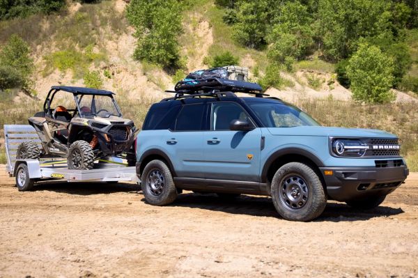 A Bronco Sport Tow RZR (szürkéskék) a Badlands modellből készült, nagy teherbírású tető keresztlécek és vontatócsomag van a fedélzeten. Az utólagos extrák közé tartozik az Aluma 6810 könnyű utánfutó, a tárolózsákok, a hűtődoboz és az utánfutón szállított Polaris RZR XP Turbo.
