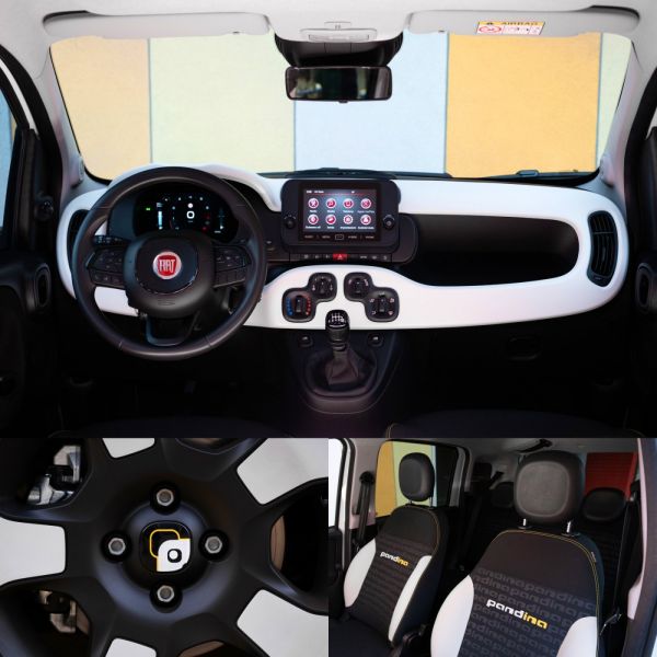 A 6 légzsák mellé sávtartót, fáradtságfigyelőt, vészféksegédet és táblafelismerőt is adnak, tempomat és automata fényszóró is van – mindezek a szélvédő mögötti kamera képe alapján dolgoznak. Digitális kijelző informálja a vezetőt, középen ott a 7 colos képátlójú érintőképernyő. Fehérre fényezik a műszerfalbetétet, dupla sárga díszvarrással dobják fel a kétszínű, Pandina felirattal nyomott egyedi üléskárpitot használnak, amit a tengerből gyűjtött hulladék feldolgozásával létrejövő Seaqual-Garn szövetből készítenek.