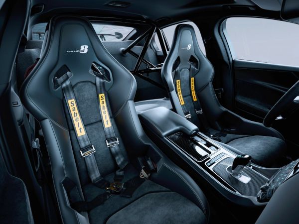 Két változatban lesz megvásárolható a Jaguar XE SV Project 8-as, a normál kivitelben elöl sportüléseket, hátul kétszemélyes padot találunk, a Track változatban csak két karbon kagylóülés van négypontos övekkel, hátra bukókeret kerül és tűzoltórendszer; 12,2 kg-mal könnyebb ez a modell. Közös az Alcantarával borított műszerfal, ez a tükröződés csökkentése miatt fontos, széria az érintőképernyős fejegység, amelyen telemetriai adatokat is meg lehet jeleníteni. Mind a 300 példány egyébként balkormányos lesz, a motor megfelelő hűtésének biztosítása miatt kellett lemondani a jobbkormányos változatról.