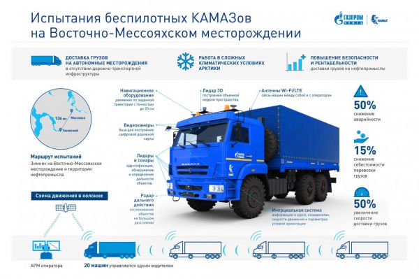 A legfontosabb előnye a sarkköri körülmények között az önjáró teherautó alkalmazásának, hogy az érzékelők segítségével a jármű rossz látási körülmények között vagy akár hóviharban is képes az úton maradni, 50%-kal nagyobb biztonsággal mozog, mint az emberi sofőrök által irányított teherautók. Ez derült ki a Gazprom Nyeft által most elvégzett sarkköri teszt során, amelynél a Kamaz által kifejlesztett robotteherautót vizsgálták – annyi módosítást hajtottak végre a konstrukción, hogy a jármű folyamatos kapcsolatban volt egy központi irányítószobával, nem volt teljesen szabadjára engedve. Miután pozitív volt a mintegy két és félezer kilométeres teszt, most kezdeményezik a jogi környezet módosítását, ami lehetővé teszi az ember nélkül közlekedő teherautók gyakorlati alkalmazását a nyilvános úthálózatról leválasztott olajmezőkön található utakon.