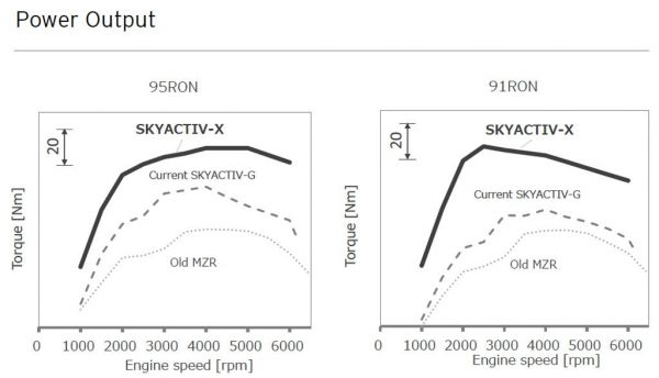 A jelenlegi Skyactiv-G elnevezésű szívómotornál 10-30 %-kal nagyobb nyomatékot kínál majd a mechanikus feltöltővel szerelt, bizonyos üzemmódban kompressziógyújtással üzemelő 2,0 literes lökettérfogatú Skyactiv-X benzinmotor, amely ezen felül jobb gázreakciót és alacsonyabb fogyasztást is ígér a harmadával jobb hatásfok miatt – a jelenlegi Skyactiv-D-nél is takarékosabb lesz az új erőforrás.