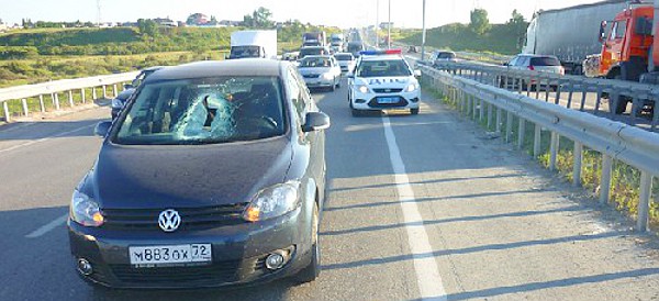 Egy Nissan Primera vezetője vesztette el az uralmát az autója fölött nemrég Oroszországban az autópályán, a megpördülő autó a sávokat elválasztó szalagkorlátnak ütközik. A szétszakadó korlát rögzítése a szembe sávban közeledő autó szélvédőjének csapódik.