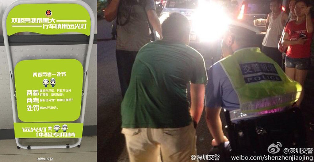 A shenzeni rendőrség az eddigi eszközökkel – értsd pénzbüntetés – nem bírta rávenni az autóvezetőket arra, hogy ne használják indokolatlanul a fényszórójukat, elvakítva ezzel a többi közlekedőt. Még 2014-ben próbálták ki, most pedig bárki számára választhatóvá tették, hogy a 300 jüanos (~ 12 300 Ft) büntetés megfizetése helyett mostantól kezdve egy percen át saját autójának vakító fényszórójába bámulhat, ezt követően a helyszínen be kell magolniuk a szabályszegőknek a vonatkozó (járművek világításának használata) jogszabályt, s csak ezt követően engedik útjára – mire ezzel végez a delikvens, már a látása is kitisztul.