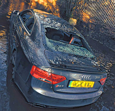 Pár napig még a víz fogságában parkolt az autó, eközben először is vandálok vették kezelésbe. Egy éjjel egy hatalmas kődarab segítségével betörték a hátsó szélvédőt, és ezzel egy időben alaposan összeverték a tetőlemezt is.