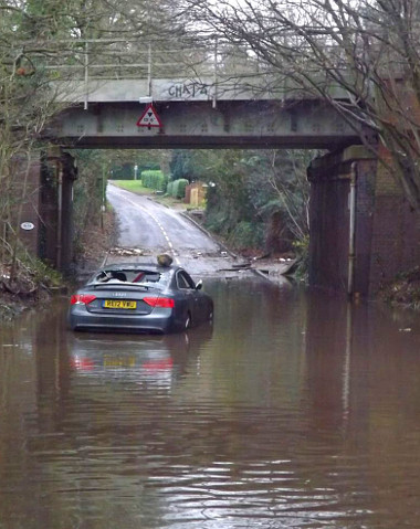 Manapság Angliában igen komoly gondot okoznak az áradások, ezeknek az áldozata lett az itt látható Audi RS5-ös kupé még január 2-án. Az ismeretlen sofőr elakadt Chertsey közelében található, vízzel teli Almners úti vasúti aluljáróban a kocsival, majd sorsára hagyta a tengelyig elmerült, 2012-ben forgalomba helyezett autót.