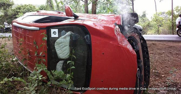 Nem teljesen tiszták a körülmények, csak az eredmény biztos: az egyautós balesetben az oldalára dőlt az 1.0 literes turbómotorral szerelt tesztautó. Miután a sofőr elveszítette uralmát a gép fölött, az megpördülés közben egy betonoszlopnak ütközött az orrával, mire felborult. A légzsákok működősbe lépése után az autó Emergency Assist nevű segélyhívó rendszere automatikusan riadóztatta a mentőegységeket, akiknek sok dolga nem akadt, hiszen egyik utas se sérült meg a balesetben, és maguktól ki tudtak mászni a roncsból. A segélyhívó – legalábbis az indiai Goában – tökéletesen működik, öt perccel a baleset után már a helyszínen volt egy mentőautó.