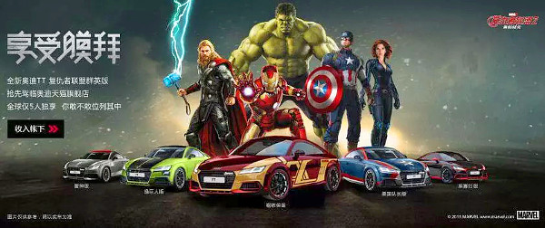 Az Audi is adott néhány autót és némi anyagi támogatást a Bosszúállók: Ultron kora című film elkészítéséhez, és most megpróbál anyagilag is tőkét kovácsolni a filmszerepből. Kínában rögtön kétféle The Avengers (a film eredeti címe) limitált szériát kínálnak, az egyszerűbb kék vagy sárga színben kérhető, a The Avengers Heroes vásárlója pedig választhat, melyik főhős karakterét akarja viszont látni autójának külsején.