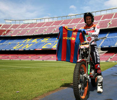 Kilencszeres triálmotor-világbajnokként végre valóra váltotta álmát, és meglátogatta kedvenc focicsapatának, az FC Barcelonának a stadionját – motorral. A Camp Nou minden porcikáját kihasználta a gyakorláshoz.