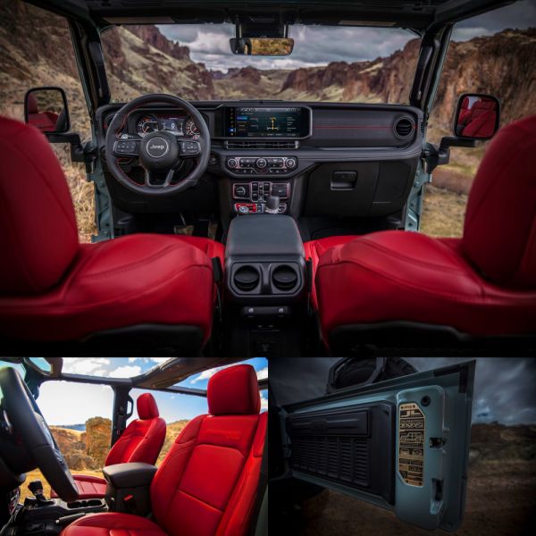 Új arccal folytatja a pályafutását a Jeep Wrangler terepjáró, de ennél sokkal fontosabb újdonság, hogy a teljesen áttervezett műszerfalon immár 12,3 colos képátlójú érintőképernyőt kapott az eddiginél nagyobb tudású Uconnect 5-ös fedélzeti rendszer. Újdonság, hogy a Willys immár állandó felszereltségként része a kínálatnak 33 col átmérőjű terepgumikkal, és ebből következően még jobb tereptudással. Opciós a levehető sarkokkal rendelkező acél lökhárító, amibe lefelé néző kamerát tesznek, a Rubicon modellekbe továbbfejlesztett Dana 44-es hátsó hidat építenek.