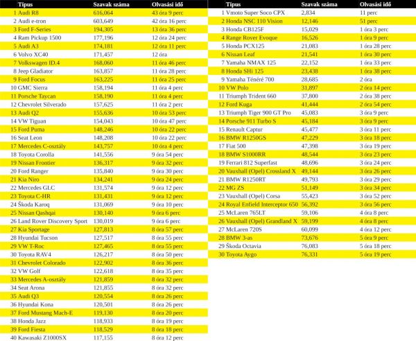Roncs és sérült autókkal foglalkozik a brit scrapcarcomparison.co.uk weboldal, amely most szövegszerkesztő program segítségével elemezte az autók és motorkerékpárok kezelési könyveit, és az összehasonlíthatóság kedvéért klasszikus irodalmi műveket is megvizsgált. Eszerint az Audi r8-as kezelési könyve a legnehezebben emészthető, 616 064 szót tartalmaz a 308 oldal, és a 238 szó/perces átlagos olvasási sebességgel számolva 43 óra 9 percbe telik a kiolvasása. Ez hosszabb, mint Tolsztoj Háború és békéje, vagy J.R.R. Tolkien Gyűrűk ura trilógiája! De nem csak a szuperautónál nem tudta magában tartani a szavakat az Audi, a dobogó második helyén az e-tron villanyautó található 603 649 szóval, amelyet jelentős lemaradással követ a bronzérmes Ford F-sorozat kezelési könyve, amely 194 305 szóból áll és alig 13 óra 36 perc alatt kiolvasható. A rend kedvéért érdemes megemlíteni, hogy átlagosan 109 106 szóból áll egy autó kezelési könyve.
