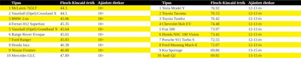 A szöveg könnyen értelmezhetőségét is megvizsgálták a Flesch-Kincaid módszertan szerint – az USA Haditengerészete dolgozta ki ezt az eljárást, hogy könnyen értelmezhető szövegeket használjanak a katonák dolgának megkönnyítésére –, ami a szavak és mondatok hossza alapján állapítja meg a szöveg értelmezésének szintjét 0-100 közötti számmal, a 70-80 pontot elérő szövegek számítanak könnyűnek. Eszerint a McLaren 765LT kezelési könyve 44,3-as szintet ért el, majd a Vauxhall (Opel) Crossland X jön 44,5-ös értékkel, a harmadik a BMW 2-es sorozat lett 45,06-os értékkel; az összes autó kezelési könyv nehezebben emészthető, mint a referenciának elemzett irodalmi alkotások. A skála másik végén a Toyota Tundra (76,42), a Toyota Tacoma (76,53) és a Tesla Model Y (76,92) szerepel, amelyet 12-13 évesek is megértenek.