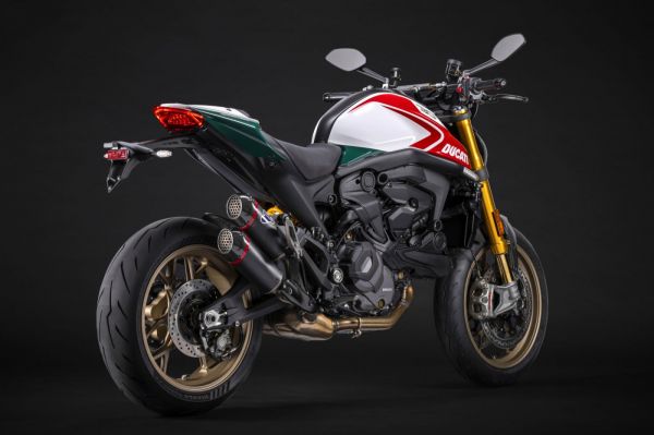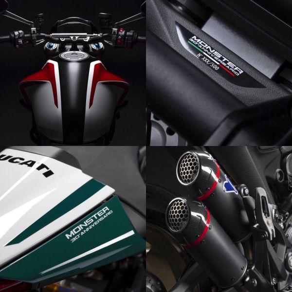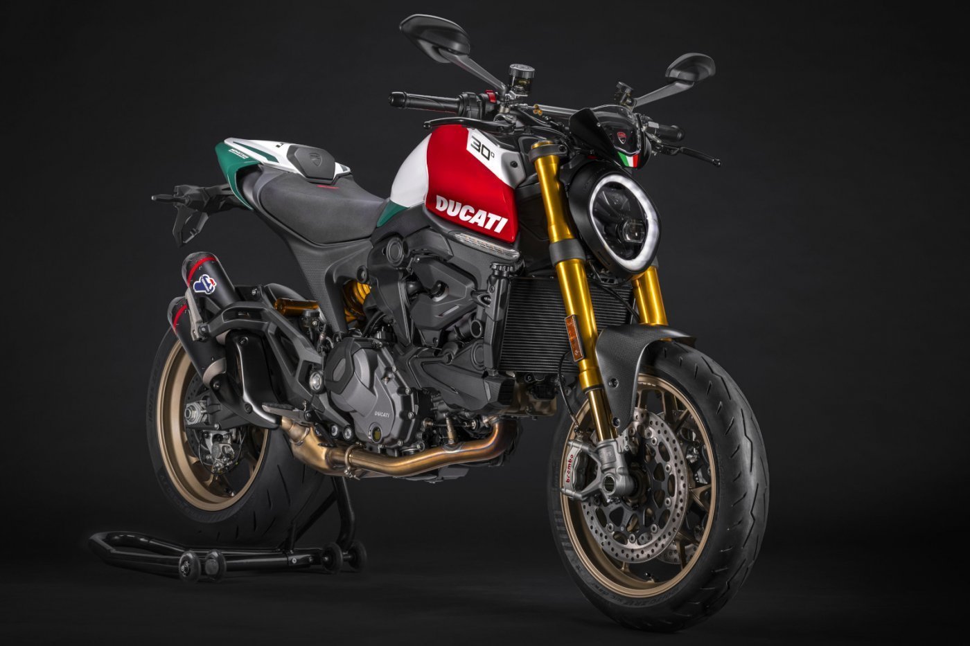 30 évvel ezelőtti bemutatása óta népszerű tagja a Ducati-kínálatnak a Monster nevű naked, amelyről most egy 500 darabos limitált szériával emlékeznek meg. Az olasz trikolór színeiből készített egyedi fényezés és a sorszámos plakett teszi különlegessé a gépet – ezzel annak olasz származását is ünneplik –, a felniket aranyszínűre fényezik, az Öhlins villát aranyszínűre anodizálják.