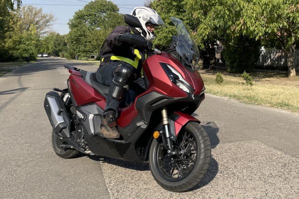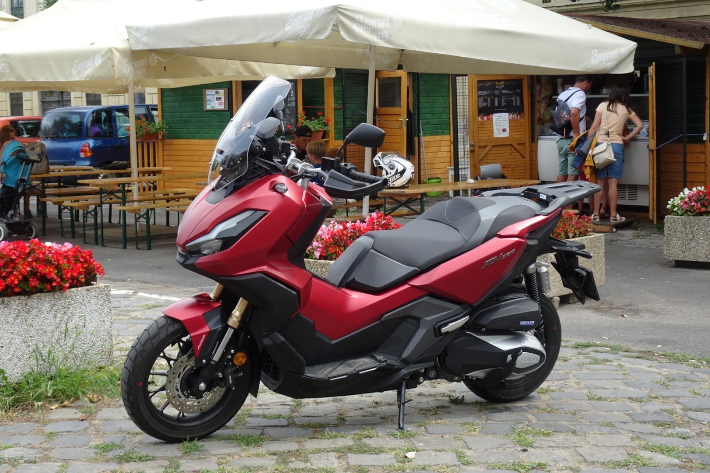 Érdeklődéssel vártam a találkozást az ADV-vel, mert az egyik ősével, az X-ADV-vel kellemes tapasztalatokat szereztem, a 330 cm3-es blokk pedig ismerős volt az SH 350-ből. Persze az X-ADV más kategória az ő 750-es motorjával, az SH pedig egy tipikus városi robogó. Lássuk hát a kettő ötvözetét, hogyan sikerült. Kinézet rendben, szín (Matte Carnelian Red Metallic) nagyon rendben, a futómű ránézésre masszív, a (visszafordított) első villa nagyobb motornál is helytállna, hátul pedig két, külön gáztartályos, progresszív rugóelem van. A rugózást elsősorban városi utakra tervezték (bár itt is van rossz útburkolat…), de megfelel országúton is. A rugóelemekről csak annyit, hogy mind Showa gyártmány. Van még kérdés?