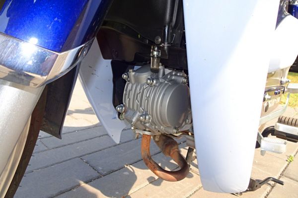 A kezdetektől fogva változatlan műanyag lábvédők között bújik meg az OHC egyhengeres, ami szimpatikus dörmögéssel, nyomatékosan viszi a járgányt akárhanyadik fokozatban. Egyébként már 40-től szépen megy negyedikben, és ha kedvező az időjárás (nincs ellenszél, szépen süt a nap), még a 100-at is eléri. Pedig a motor még a 10 lóerőt sem éri el, gyári adat szerint 9,7 lóerős. A fokozatok elég hosszúak, nem kell szétforgatni a kis vasat.