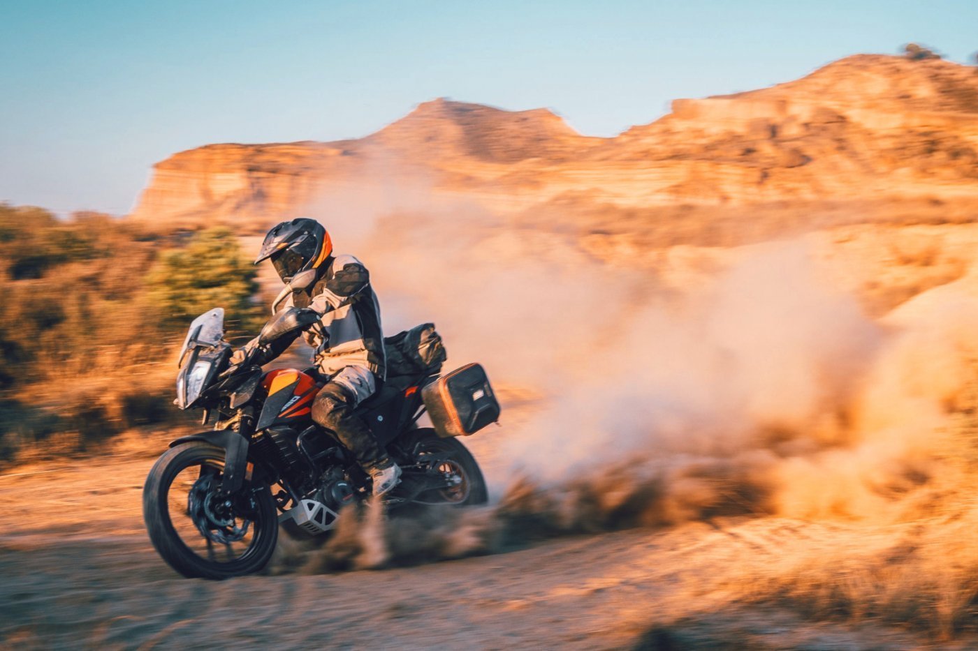 A 372 cm3-es, 44 lóerős, egyhengeres blokk ne tévesszen meg senkit, stílusát ugyanis a nagytesóktól kölcsönözte az újdonság. Kis túlzással úgy néz ki, mintha bármikor neki lehetne vele vágni egy sivatagi túrának, 855 mm-es ülésmagasságával pedig túl is tesz a 790 Adventure-ön. Már alapból olyan gumival érkezik (Continental TKC70), amellyel alkalmas közepes terep leküzdésére is, de a 19 colos első kerékméret, a 200 mm-es szabad hasmagasság, vagy a szériafelszereltségbe tartozó kézvédők is utalnak a felhasználási körre.