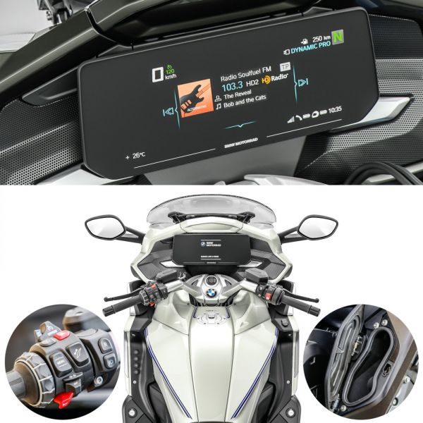 Ahogy a legtöbb BMW motorkerékpárnál már beköszöntött, úgy a K 1600-asoknál is eljött a méretes digitális kijelzők kora, a 10,25 colos monitorhoz természetesen okostelefon is párosítható, és nemcsak a navigációs utasításokat, hanem akár a teljes térképet is megjeleníti. A modellfrissítéssel az audiorendszer is változott, az egyszerűen 2.0 névre keresztelt újdonság a GTL és Grand America verziók esetében alapáras, míg a GT és B változatoknál extraként rendelhető.