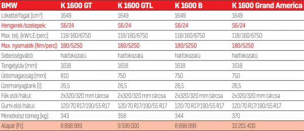 Mivel a K 1600-asok piaci pozíciója eddig is erős volt, érthető, hogy az árazásnál nem volt szívbajos a BMW, a GT báziskivitel 8,9, míg a legdrágább Grand America 10,2 millió Ft-tól vihető haza. Utóbbi még ezzel együtt is csak a negyedik legdrágább motor a bajorok kínálatában, hiszen az M 1000 RR szupersportgép (11,9 millió Ft), az R 18 Transcontinental retró túramotor (11,1 millió Ft) és az R 18 B bagger (10,5 millió Ft) is megelőzi.