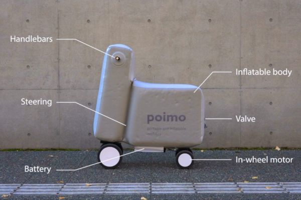 A Poimo név betűszó, az angol POrtable and Inflatable MObility kifejezésből származik, ami annyit tesz: hordozható és felfújható mobilitás. Ez a lényege a Tokiói Egyetemen készített járműnek, amelyen úgy kell ülni, mint egy motorkerékpáron, használat után pedig elég leengedni a levegőt a testből, és ezt követően kis méretűre összehajtható a szerkezet.