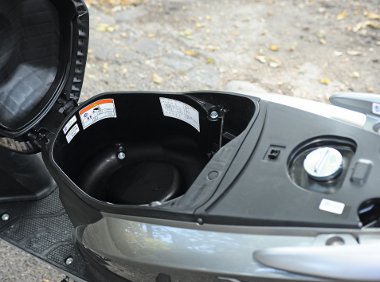 Sajnos sokkal nagyobb hiba, hogy az üzemanyagtartályt úgy helyezték el, hogy az ülés alatti rekeszben nem fér el egy normál méretű bukósisak, maximum egy kisebb bevásárlás tartalmát rakhatjuk oda, ha nem szeretnénk akasztófülre függeszteni csomagunkat. Emellett a fejidomnál találunk még két rekeszt, pontosabban üreget, melyek használati értékét csökkenti, hogy teljesen nyitottak, s így persze nem is zárhatók.