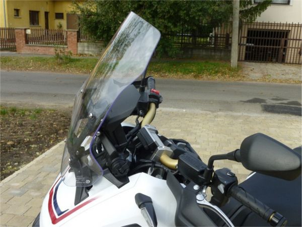 Ez a szélvédő magas állásban. Az állítás kézi, menet közben nem történhet, de van! – és ez a lényeg. Én a magas állásban használtam, így jó a szélvédelem nagyobb tempónál is. Az állítási tartomány 135 mm.