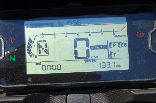A műszerfal eltér a régi modelltől, az LCD képernyő mellett például van egy kis téglalap alakú lámpácska (ezen a képen nem látszik, mert menet közben világít). Halványan, nem vonja el a vezető figyelmét, de ott van. Ha zöld, akkor a motoros gazdaságosan közlekedik. Ha kék, akkor már kevésbé, és ha nagyon tolja neki a vezető, akkor elalszik, mert úgyis mindegy.