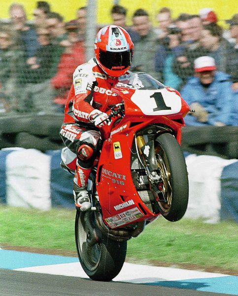 A Ducati 916-os az olasz márka legsikeresebb modellje a versenysportban. A típus 1994 és 1998 között szerepelt a superbike-világbajnokságon, és összesen 8 vb-címre, 4 egyéni és 4 gyártói vb-aranyra volt képes. A 916-os az első viadalán, az 1994-es superbike szezonnyitón azonnal győzni tudott, míg az első idényében rögtön világbajnok is lett. A motorral a brit Carl Fogarty 3 (képünkön), míg az ausztrál Troy Corser 1 vb-elsőségre volt képes. A Ducati 916 összesen 65 futamgyőzelmet aratott. 1994-es bemutatkozó szezonjában 150 lóerőt tudott, míg a legerősebb, 1997-es típus 168 lóerőre volt képes.