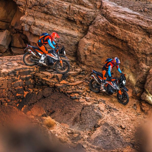 Bár a többi Adventure típusból kiindulva az alapkivitel is zokszó nélkül bírja majd a terepet, a KTM R-változatot is kínál, amely krosszgép stílusú első sárvédőjéről és kisméretű szélvédőjéről könnyedén felismerhető. A keményvonalas verzió emellett hosszabb tengelytávval, 43 helyett 48 mm-es teleszkóppal, illetve három centivel nagyobb szabad hasmagassággal büszkélkedhet – a kormánylengéscsillapító, a kipörgésgátló, a menetprogram-választó, a kanyar-ABS és a nappali fénnyel ellátott full-LED-es fényszórók mindkét változatnál alapárasak.