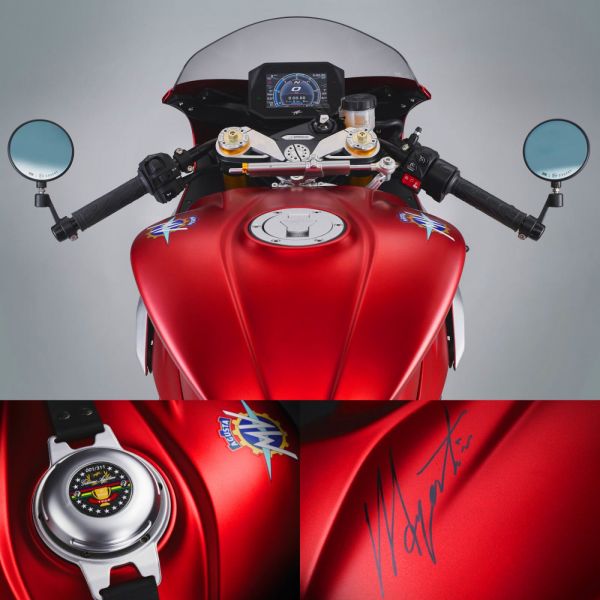 A gyár most viszonozza a szívességet egy limitált motorkerékpár piacra dobásával, a Superveloce Ago elnevezésű gép a korabeli szürke-vörös versenyszíneket viseli magán, és számos egyedi részletet kap. A 311 darabos limitált széria első 15 példánya a legendás versenyző saját kezű aláírását is viseli majd egyedi karbon tanksapkával együtt – ezekkel emlékeznek meg a világbajnoki címekről.