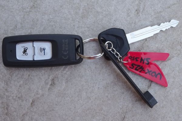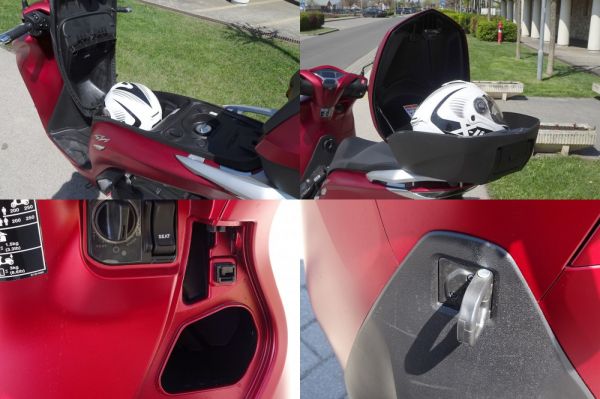 Sisakoknak az ülés alatti tároló vagy a felső doboz ad helyet. Ha már rakodóhelyről van szó, az első burkolatban is van, ide például a telefont be lehet tenni úgy, hogy közben töltést is kaphat (USB-C csatlakozóról, amelynek teljesítménye 15W). A Smart kulcsot nem kell elővenni, ha megközelítem a járművet, csak elfordítom a gyújtáskapcsolót, és vagy a mellette levő, SEAT feliratú kapcsolóval tudom nyitni az ülést, vagy ha tovább fordítom, feléled a járgány és indítható a motor. Diszkrét, világító kék gyűrű a kapcsoló körül jelzi, hogy érzékeli a kulcsot, és működőképes. A leállítás is történhet ennek az elfordításával, vagy a jobboldali kormányfogantyú (közismertebb nevén: gázmarkolat) melletti gyorsleállítóval. A jármű magára hagyása előtt ne felejtsük el benyomva elfordítani, ekkor a kormányzár kapcsolódik be; mindössze az érzékelő hatósugarában kell lenni a kulcsnak.